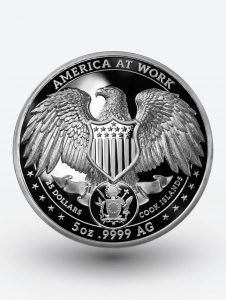 I now direct your attention to the reverse, where an American eagle sits in quiet repose, keeping a watchful eye on all who pass. You’ll notice our national symbol is protected by an iconic shield festooned with American iconography. Below you’ll find The Cook Island Coat of Arms, alongside the confirmation that what you’ll receive when you place your order, (along with the satisfaction of knowing you’re helping train the next generation of skilled workers,) is five ounces of .9999 silver – the purest silver money can buy.