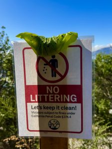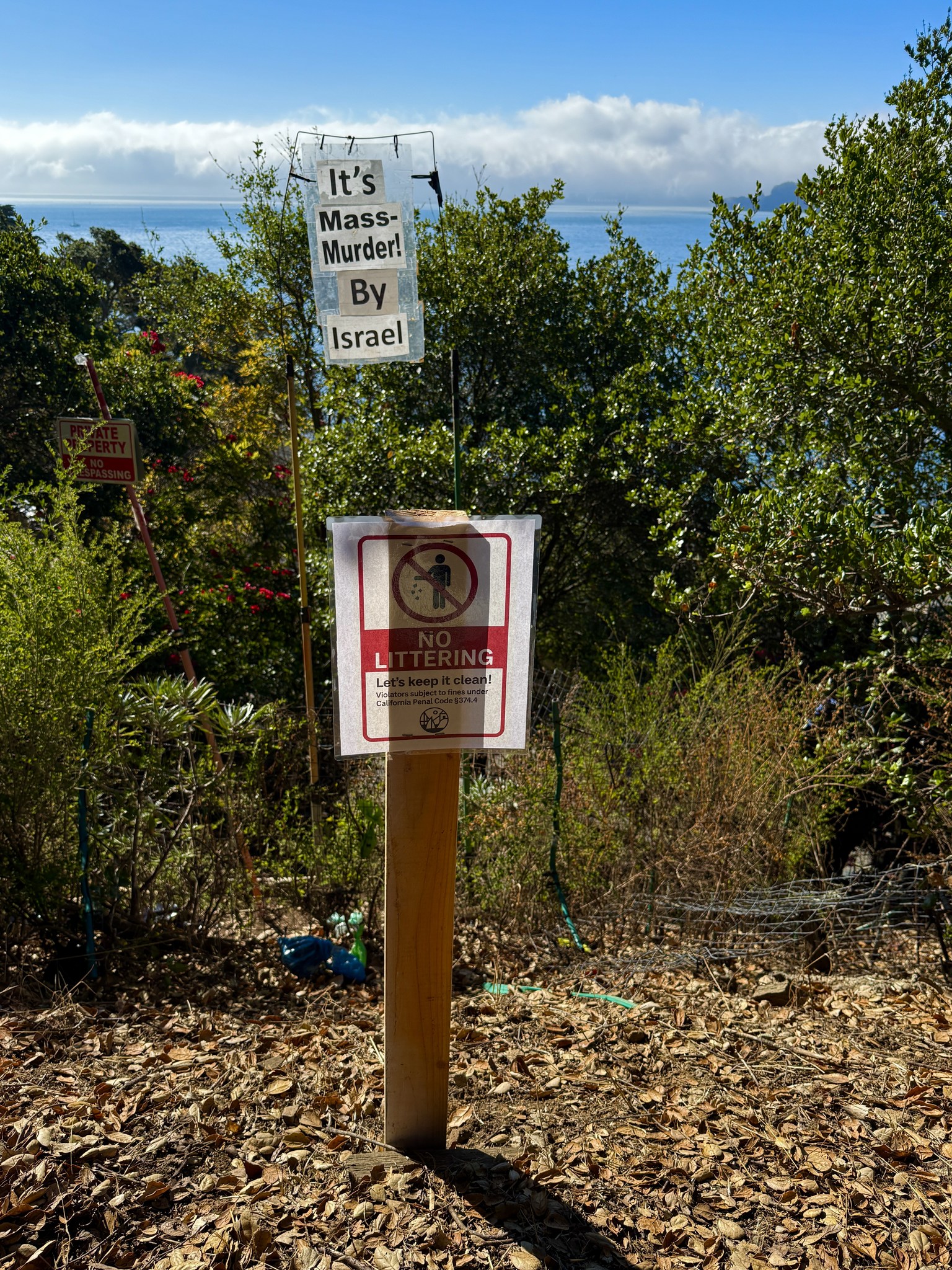 None of it was pretty, but the presence of all that dogshit had created a strange equilibrium. For months, the owner of the sign continued to exercise his Constitutional right to publicly condemn the Jews, as offended passersby expressed their own opinion with bags of dogshit. No one got hurt, no property was damaged, and everyone felt heard. Alas, after several months of this mostly fecal protest, the owner of the sign grew weary of cleaning up after other people’s dogs and complained to our elected officials about the sudden littering epidemic that had broken out on the edge of his property. And yesterday, our elected officials responded by adding a new sign to the tableau, imploring the residents to stop littering, or suffer the consequences of violating California Penal Code, 374.4, which I must say made for some interesting reading prior to this post.
