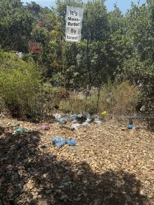 compelled the owner of the sign to remove it. Though it is very close to the street, the sign is on private property, and the sentiment thereon is clearly protected by the first amendment. Several months ago, however, residents with a different worldview began expressing their displeasure, by leaving bags of dogshit at the base of the sign. Others followed suit, and soon, the leafy hillside on the side